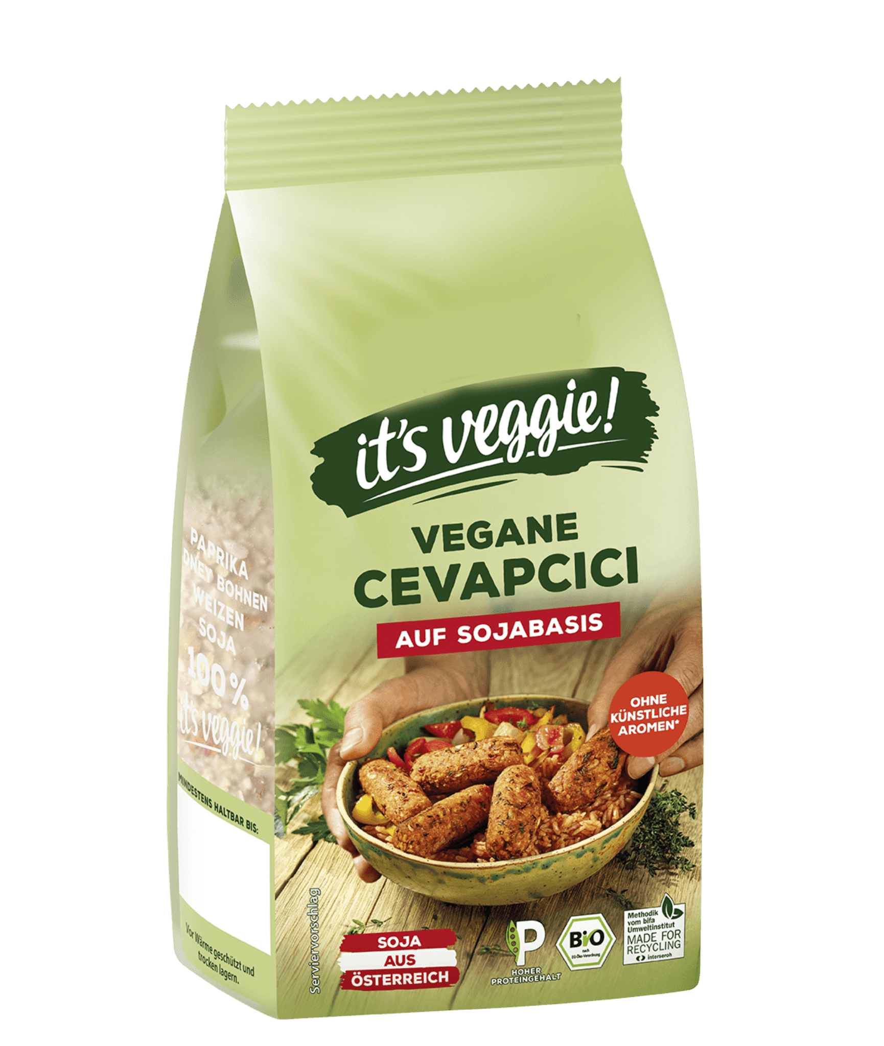 Unsere veganen Cevapcici von „it’s veggie“ sind eine pikant-würzige Fleischalternative mit hohem Proteingehalt, die schnell und einfach zubereitet werden können. Die schmackhaft gewürzten Röllchen sind eine ideale Beilage, Fingerfood oder können mit (veganem) Tsatsiki oder anderen Dips serviert werden. Sie sind ohne künstliche Aromen** erhältlich und eignen sich perfekt als Ergänzung für den nächsten Grillabend. Die Vorteile unserer veganen Cevapcici sind, dass sie vegan sind, einen hohen Proteingehalt haben, auf Sojabasis hergestellt sind und das Soja aus Österreich stammt. Die Verpackung besteht aus Monofolie und ist sehr gut recycelbar.